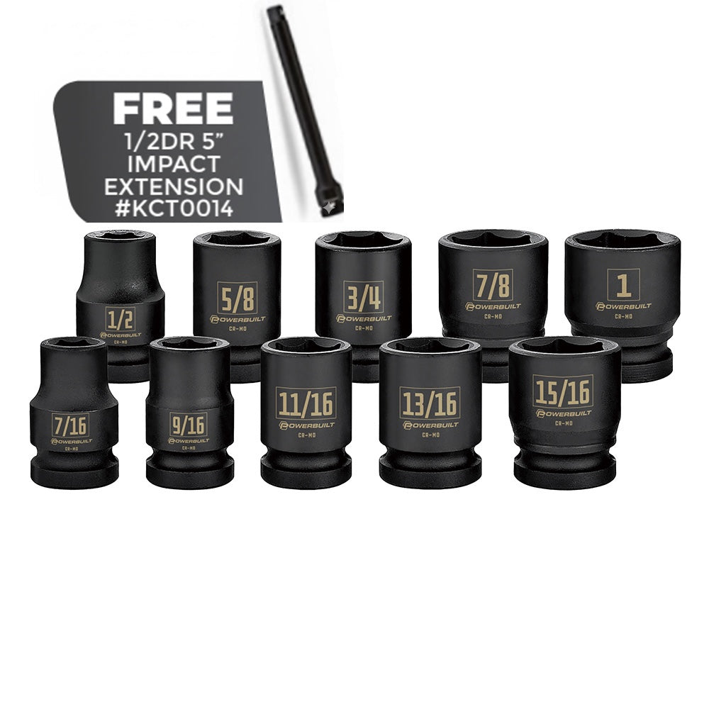 Powerbuilt 1/2" Dr 10pc Imperial Impact Socket Set - Free 1/2dr 5” Impact Extension