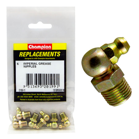 C108-11 | Champion 1/8in NPT (Briggs) 90-Deg. Grease Nipple -6pk Description BRIGGS 90 Pack Size: 6