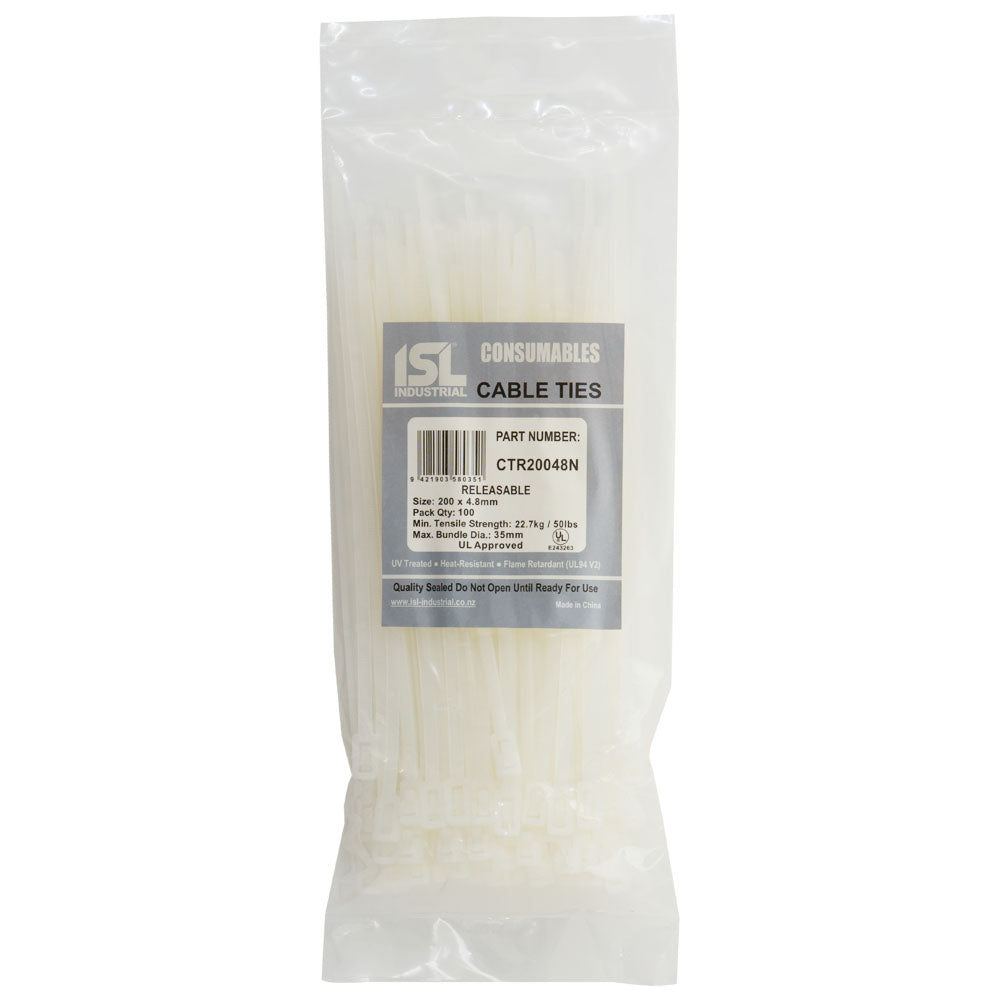 ISL 200 x 4.8mm Nylon Releasable Cable Tie - Nat - 100pk