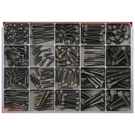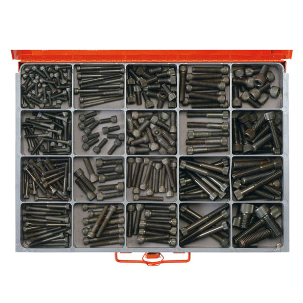 CA2300 - Master Kit 300PC SOCKET HEAD CAP SCREW ASSORTMENT BSW High Tensile 25 Sizes: 3/16 x 5/8 to 1/2 x 2-1/4 300 Pieces Replacement Packs Available Part # Size Pack Qty C91203010 3/16 x 5/8 40 C91203020 3/16 x 1-1/4 30 C91203024 3/16 x 1-1/2 30 C91203028 3/16 x 1-3/4 30 C91203032 3/16 x 2 10 C91204010 1/4 x 5/8 10 C91204020 1/4 x 1-1/4 15 C91204024 1/4 x 1-1/2 10 C91205010 5/16 x 5/8 20 C91205012 5/16 x 3/4 20 C91205016 5/16 x 1 10 C91205020 5/16 x 1-1/4 10 C91205024 5/16 x 1-1/2 10 C91205028 5/16 x 1-3/4 5 C91205036 5/16 x 2-1/4 10 C91205040 5/16 x 2-1/2 5 C91206012 3/8 x 3/4 10 C91206024 3/8 x 1-1/2 10 C91206028 3/8 x 1-3/4 3 C91206032 3/8 x 2 2 C91206036 3/8 x 2-1/4 3 C91208012 1/2 x 3/4 4 C91208020 1/2 x 1-1/4 1 C91208028 1/2 x 1-3/4 1 C91208036 1/2 x 2-1/4 1
