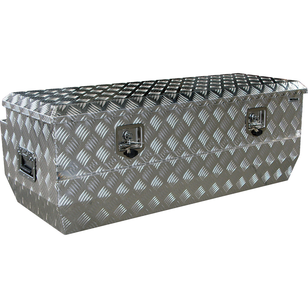 PE9115 | Aluminium Chest Ute / Truck Box 1220mm The ProEquip Aluminium Chest Ute/Truck Box is a perfect choice for storage anywhere making it simple to transport items wherever you need them. Use it on a Flatbed Ute Truck Trailer in your shop on your deck and more. Features • 1.5mm Aluminium Checker-Plate construction • Stainless Steel T-Locks for extra security • Full welded seams with a continuous Aluminium Piano-Style hinge* • Gas Struts allow for easy single-handed entry • Huge space for big power tools storage • Aluminium Frame • Dimensions: L 1220 x W 505 x H 455mm *Please Note: This ProEquip Aluminium Storage Box is fully welded with foam seal aluminium full length piano style hinge and two stainless T-Locks to help reduce moisture ingress. Warranty: This product carries a limited 3 month warranty against faulty materials and manufacture only. Water ingress is not covered by this warranty.