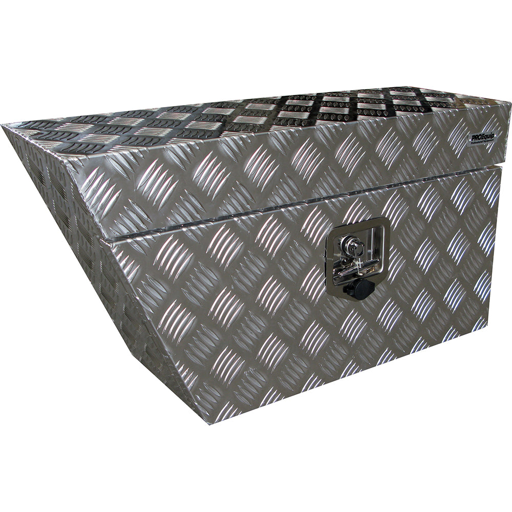 PE9110 | Locking Underbody Tool / Storage Box RIGHT SIDE OF TYRE This PROEquip Locking Underbody Storage Box offers the perfect solution for extra storage underneath a Flatbed Ute Truck or Trailer where placement is required near wheels. Manufactured from Heavy Duty 2.0mm thick Checker-Plate Aluminium with rubber lid seal and Stainless Piano Hinge. The Locking T-handle Latch provides good security while using minimum space. This box is for installing on the RIGHT side of tyre any side (For LH side of tyre choose PE9111). Features • 2.0mm Aluminium Checker-Plate construction • Downward opening lid with chain stop • Full welded seams with a continuous aluminium Piano-Style hinge* • Weather-Resistant design with 360° seal around the lid keeps the elements out* • Stainless Steel T-Lock for extra security • Dimensions: L 750 (top) / L 580 (bottom) x W 250 x H 400mm • Net Weight (empty): 7.9kg *Please Note: This ProEquip Aluminium Storage Box is fully welded with full rubber seal aluminium full length piano style hinge and has a stainless T-Lock to help reduce moisture ingress. Warranty: This product carries a limited 3 month warranty against faulty materials and manufacture only. Water ingress is not covered by this warranty.