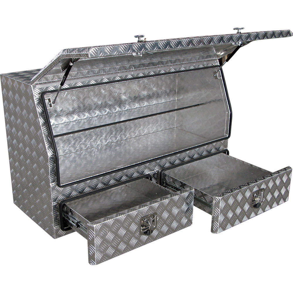PE9124 | Aluminium High Side Heavy Duty Truck Box (2 Drawer) The ProEquip Aluminium High Side Ute/Truck Box adds organisation typically not available in a tool box. The side opening lid is a nice touch making it easier to get in and out what you need. Manufactured from Heavy-Duty 2.5mm thick Aluminium Checker-Plate material provides exceptional durability and a professional look. Featuring rubber lid/drawer seals and Stainless Piano Hinge with Locking T-Handle Latches provides secure storage for your tools and other valuables. Features • Heavy Duty 2.5mm Aluminium Checker-Plate construction • Gas Struts to hold lid • Stainless Steel T-Locks for extra security • Two bottom drawers • Fixed shelf inside • Full welded seams with a continuous Aluminium Piano-Style hinge* • Weather-Resistant design with 360° seal around the lid and drawers keeps the elements out* • Constructed of Heavy-Duty Aluminium material for exceptional durability and a professional look • Aluminium Frame • Reinforced Lid adds strength and durability • Dimensions: L 1425 x W 600 x H 850mm • Net Weight (empty): 64.7kg *Please Note: This ProEquip Aluminium Storage Box is fully welded with full rubber seals aluminium full length piano style hinge and stainless T-Locks to help reduce moisture ingress. Warranty: This product carries a limited 3 month warranty against faulty materials and manufacture only. Water ingress is not covered by this warranty.