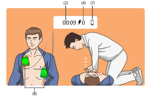 - 1.96cm status screen which displays number of shocks delivered, operating time and battery level. Pads glow to indicate correct patient contact.