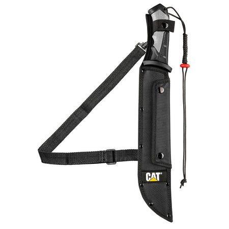 Included is a CAT branded black nylon sheath with a belt loop and shoulder strap for multiple carry options. It also includes a paracord lanyard for safe blade retention.