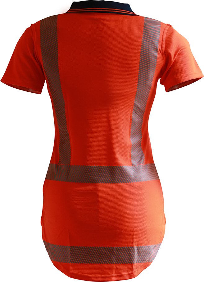 Microfibre fabric, heat applied segmented tape, buttoned front closure, long back tail, colour trimmed dark collar