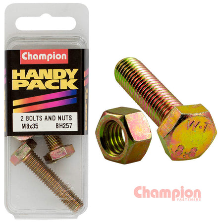 BH257 | Champion Hex Set Screws M8 x 35mm & Nuts-M8 x 1.25mm High Tensile Screw-GR 8.8 Nut-Class 8 Screw: 8mm x 35mm Nut: 8mm x 1.25mm Pack Size: 2