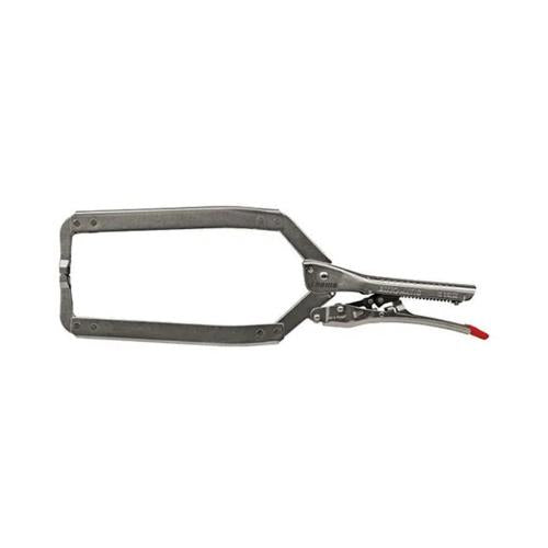 TM605-104 | Ehoma Automatic Locking Plier C Clamp Regular Tip 450mm Features Automatic locking action - locks to any size without adjustment whilst maintaining the highest pressure. Jaws are automatically adjusted to any size whilst maintaining the same clamping pressure. Clamp-free release lever remains locked until released. Rust resistant nickel plated finish. Wide-opening jaws provide greater versatility in clamping a variety of shapes. Specifications Length:450mm Jaw capacity: 220mm