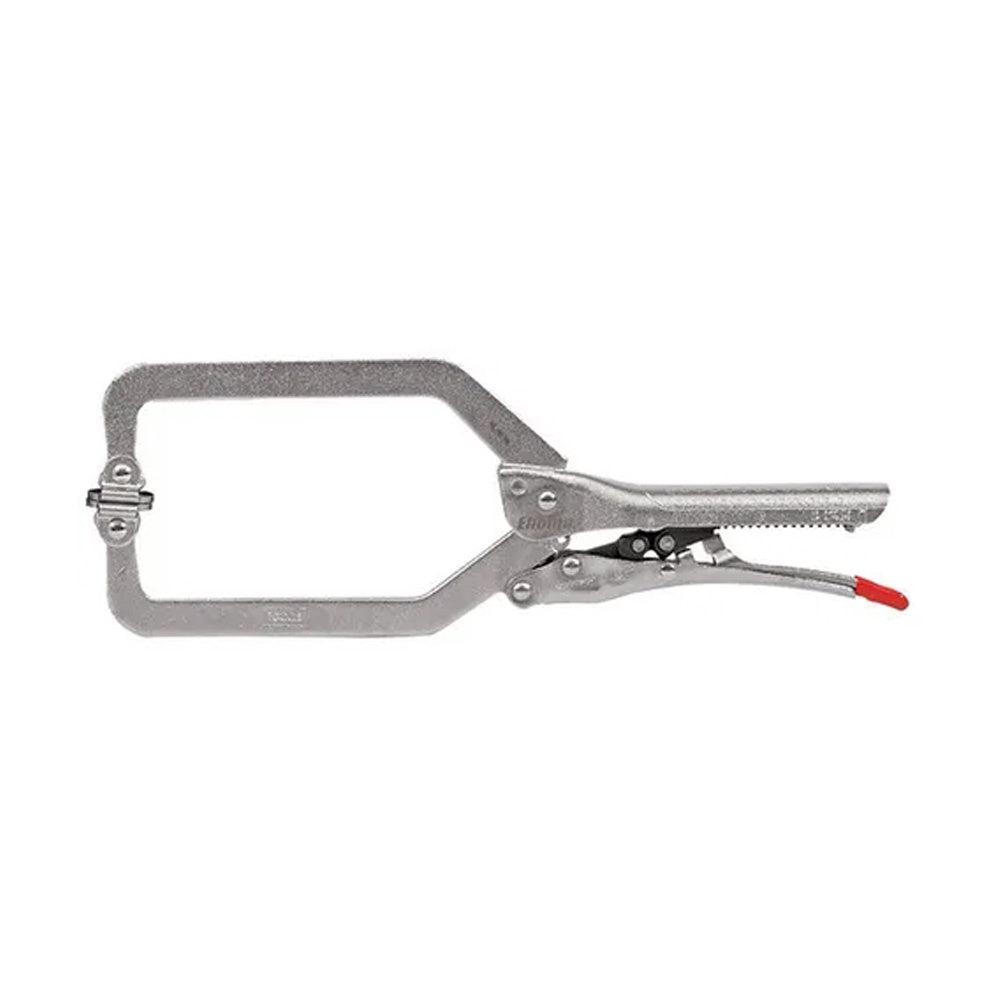 TM605-011 | Ehoma Automatic Locking Plier C Clamp Swivel Pad 225mm Features Automatic locking action - locks to any size without adjustment whilst maintaining the highest pressure. Jaws are automatically adjusted to any size whilst maintaining the same clamping pressure. Clamp-free release lever remains locked until released. Rust resistant nickel plated finish. Wide-opening jaws provide greater versatility in clamping a variety of shapes. Swivel pads hold tapered work awkward fabricating jobs and delicate projects without damaging the work surface. Specifications Length:225mm Jaw capacity: 112mm