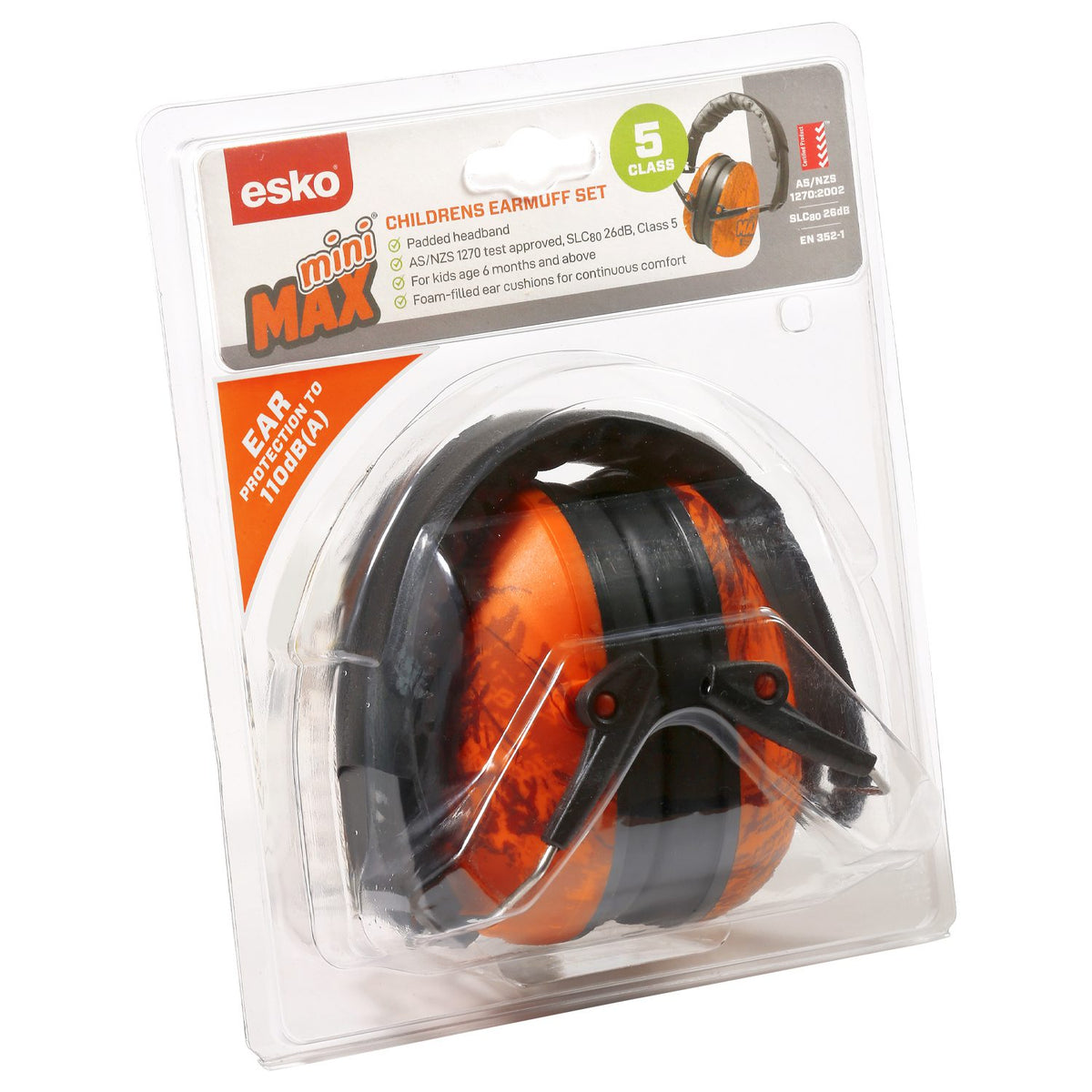Esko MiniMax Kid's Earmuff Class 5, 26dB, AS/NZS 1270:2002 - Orange Camo