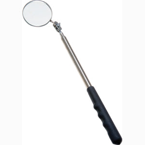 ULLMAN EXTRA LONG MAGNIFY INSPECTION MIRROR 2-1/4IN / 57MM DIA. Telescopes from 12 (305mm) to 4ft (1219mm) • Clear glass mirror for perfect reflection. • All-angle ball joint holds mirror firmly for 360 degree viewing. • Mirror encased in rugged corrosion resistant brushed stainless steel. • Long aluminium shaft can be bent at any angle to retrieve dropped metal objects in hard to reach areas. • Comfortable textured cushion grip keeps handle secure in wet or oily hands.