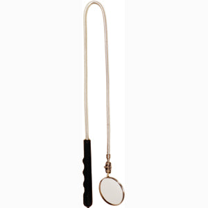 ULLMAN FLEXIBLE INSPECTION MIRROR 2-1/4IN / 57MM DIA. Overall length 34.25 (870mm) • Clear glass mirror for perfect reflection. • All-angle ball joint holds mirror firmly for 360 degree viewing. • Mirror encased in rugged corrosion resistant brushed stainless steel. • Long aluminium shaft can be bent at any angle to retrieve dropped metal objects in hard to reach areas. • Comfortable textured cushion grip keeps handle secure in wet or oily hands.