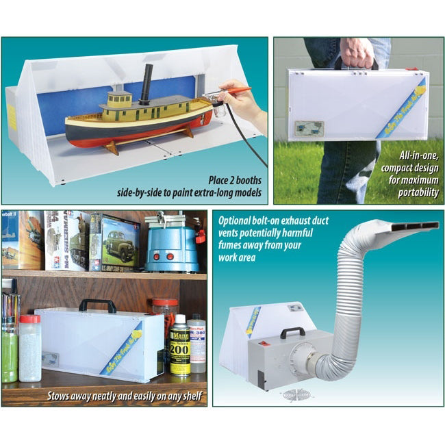 Mini spray booth - folds into portable case with carry handle and includes exhaust duct.