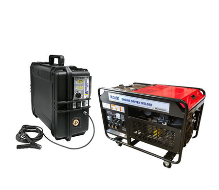 KOVO Generator and GYS Voltage Sensing Wire Feeder PackageThe Kovo 320 Welder Generator is a compact but powerful 300Amp Brushless DC welding Power Source amp Generator Its V Twin Kohler produces 32Volts300Amps of both Constant Current CC and Constant Voltage CV welding output power capable of running a Suitcase Wire Feeder with 0916mm Wire Running 26mm Electrodes for Arc Welding and 5 and 6mm Carbons for Air Arc GougingIt has 3KVA of AC power enough to run all your portable tools on site grinders etc Its small compact size allows for easy transportation on the back of a Ute or trailer and allows for easy moveability once on site It has an Auto Idle Function which automatically increases the RPM when load is applied saving fuel and limiting noise on site this machine has it all Powerful 300Amp Brushless DC welding Power Source amp Generator 3KVA of AC power Auto Idle Function Stepless Current amp Voltage Controls for precise setting Electric Start Digital Hour meter for keeping track of run time for servicing Fuel Site Gauge Stepless Current amp Voltage Controls for precise setting