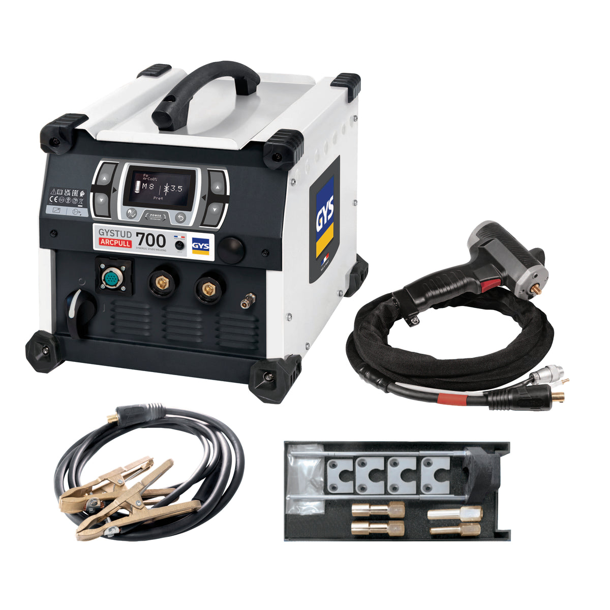 The ARCPULL 700 is a threephase inverter pulled arc welding machine that can weld addons studs internally threaded studs insulation nails pull rings rivet extraction rods etc on aluminum or steelbased materials It has a Synergic operating mode and a Manual operating mode The Programs menu can be used to store and recall welding configurations It has a connection for PLC controlThere are 4 main stages priming stripping arcing and attachmentPriming the addon part pulling ring studs etc is brought into contact with the support sheet Pressing the trigger starts the welding process the generator sends current into the stud the gun axis rises slightly and a lowintensity electric arc is createdStripping this phase could also be called preheating The generator regulates a current to ensure a low intensity electric arc the heat generated by this arc allows to burn the impurities of the support sheet greases oils electrolytic zinc plating to preheat the two parts and therefore to limit the thermal shock of the welding arc in order to improve the quality of the weldDuring this phase neither the insert nor the support sheet melts Similarly this phase does not allow the zinc layer of the galvanized sheet to be releasedThe arc the generator significantly increases the current to create a very energetic arc creating a molten pool on the support sheet and causing the end of the insert to meltThe attachment The gun plunges the insert into the molten pool