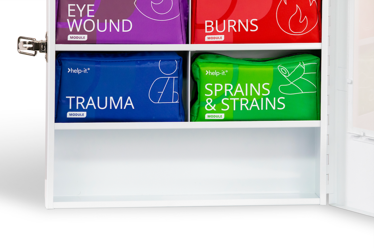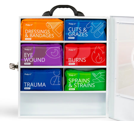 The Help-It Modular Hub First Aid Station features six colour-coded, injury-specific modules securely housed in a durable wall-mounted cabinet with a clear Perspex front. This design keeps first aid essentials highly visible, accessible, and protected, ensuring rapid response in emergencies.