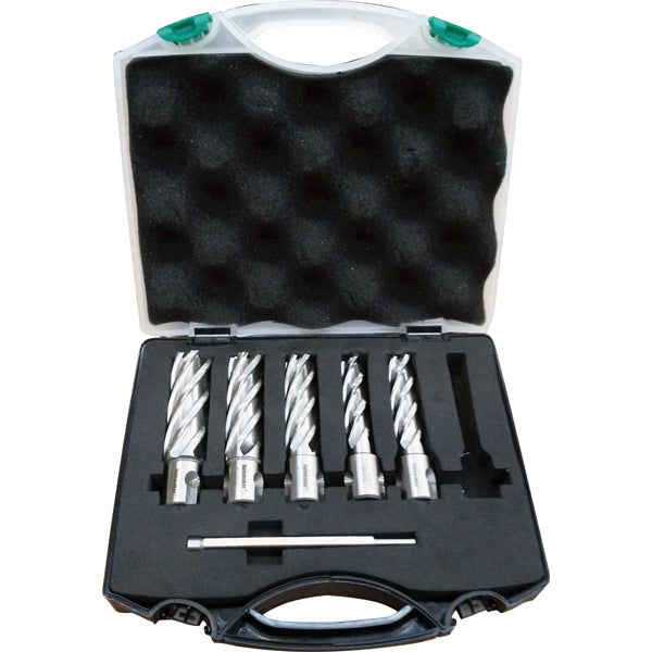 6 Piece 25mm Depth Metric Silver Series Annular Cutter Set Brand: HOLEMAKER Part Number: ASSET-C Hole Diameter: 12mm Depth of Cut (DOC): 50mm Pilot Pin Diameter: 6.35mm (Use code SP16004) Shank Diameter: 3/4in | 19.05mm Kit Includes: 14mm x 50mm 16mm x 50mm 18mm x 50mm 20mm x 50mm 22mm x 50mm Pilot Pin To Suit Description: M2AL HIGH SPEED STEEL MATERIAL M2AL High Speed Steel is a high alloy material with a hardness of up to 67.5 HRC designed for increased endurance of the cutting edge and tool life. STEP HARDENED PROCESS This state of the art manufacturing process produces cutters with extremely hard tooth tips for increased cutter performance while maintaining a softer body which is less susceptible to breakage than standard high speed steel cutters. MULTI-CUT GEOMETRY Provides smooth and fast cutting with decreased chatter. This also increases the cutters ability to remove swarf away from the cut and helps to enhance centering. FULLY GROUND WITH INTERNAL RELIEF This feature allows Holemaker cutters to produce reamed quality burr-free holes and also helps to reduce torque and horsepower requirements. UNIVERSAL SHANK 19.05mm (3/4in) Universal Shank with 2 flat sections to suit most magnetic base drilling machines.