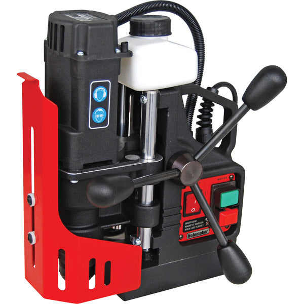 HMPRO35 - HOLEMAKER PRO35 Magnetic Base Drill • The Holemaker PRO 35 is a high quality compact and robust fully featured machine. Weighing in at just 10kg this machine is ideal for those on-site and overhead tasks. • Features include a gravity feed coolant system with a magnetically attached coolant bottle allowing coolant feed whilst drilling in vertical applications. • The feed handles can be placed on either the left or right hand side providing further versatility when using this compact machine in tight positions. • Dual rail slide system provides rigidity and eliminates the need for gib adjustments. * 12mm twist drill capacity using Weldon shank twist drill bits. Specifications: • Capacity (Diameter/max) - 35mm • DOC (Depth of Cut/max) - 52mm • Height (min / max) - 306mm / 376mm • Capacity (Twist Drills) - 12mm (Weldon Shank ONLY) • Motor Input Power - 1000 Watt • Motor Output Power - 920 Watt • Speed - 350rpm • Magnet Dead Lift - 9500Nm (25mm steel plate) • Weight - 10.0kg **SUPPLIED IN CARRY CASE WITH CUTTER GUARD & SAFETY STRAP**