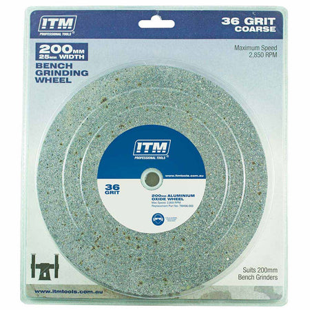 TM406-003 | ITM Grinding Wheel Aluminium Oxide 200 x 25mm 36 Grit Coarse Wheel comes complete with a multi bore bush. This caters for 1/2 inch (12.7mm) 5/8 inch (15.88mm) 3/4 inch (19.05mm) and 1 inch (25.4mm) shaft sizes. Universal Fit: To use the wheel push out the bushes smaller than the shaft size of your grinder.