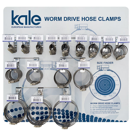 KA1110028005 | Kale 160pc Wall Merchandiser w/Stock WD 9mm W2 KALE WORM DRIVE HOSE CLAMP WALL MERCHANDISER A convenient solution for the storage and selection of the right KALE worm drive clamp for a wide range of applications and environments. MERCHANDISER FEATURES Stocked with 16 sizes from 8-12mm to 90-110mm (160 pieces) Heavy duty backing board manufactured in sturdy galvanised steel Supplied with twin hooks with size / barcode ticket holders Unique size finder allows easy selection of correct size clamp Barcode tickets and extra scan sheet supplied CLAMP FEATURES Manufactured in Europe according to DIN 3017 Strong durable mechanically locked housing Compact space saving housing design Burr free Convex band edges High clamping force with low tightening torque CLAMP MATERIALS W2 semi-stainless (all 9mm bandwidth) Contents BANDWIDTH DIAMETER QTY 9mm 8-12mm 10 9mm 8-16mm 10 9mm 12-20mm 10 9mm 12-22mm 10 9mm 16-27mm 10 9mm 20-32mm 10 9mm 23-35mm 10 9mm 25-40mm 10 9mm 30-45mm 10 9mm 32-50mm 10 9mm 40-60mm 10 9mm 50-70mm 10 9mm 60-80mm 10 9mm 70-90mm 10 9mm 80-100mm 10 9mm 90-110mm 10