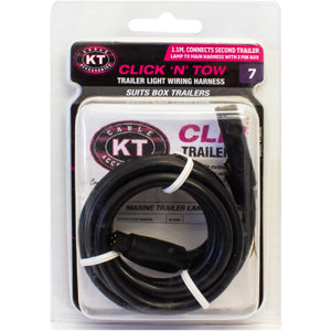 KT Click N Tow Trailer Light Wiring Harness System The KT Click N Tow Trailer Light Wiring Harness System is a simple colour coded wiring system which is waterproof universal and compatible with all brands of trailer lamps. The System is designed for a simple easy Trailer Light Wiring Harness Installation. Simply Click N Tow. KT58050 - KT C N T 4P TO 4P LEFT LAMP HARNESS Connects second trailer lamp to main harness with 2 pin AUX - 1.1m Suits box trailers Colour Code #7 (Purple)