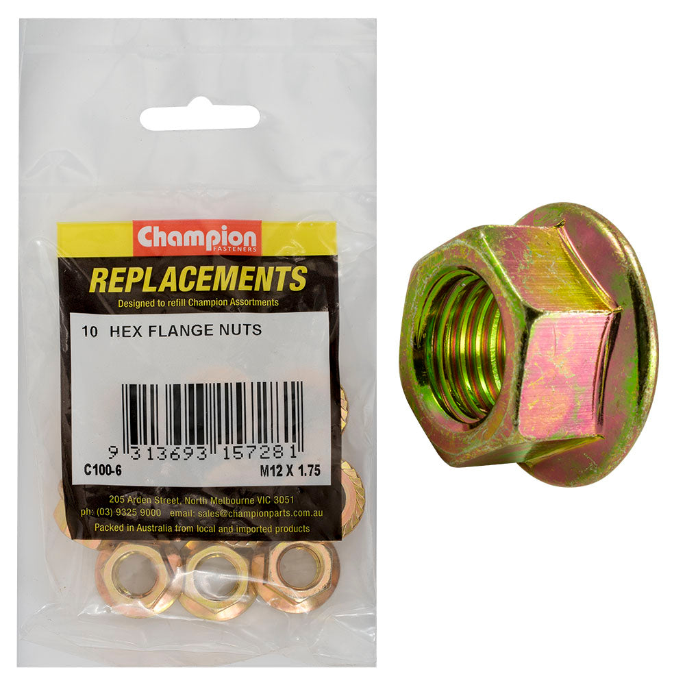 C100-6 | Champion M12 x 1.75 Hex Flange Nut -10pk Description Fine Pitch Zinc Plated Pack Size: 10