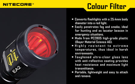 This Red Filter from Nitecore is a flashlight accessory that will fit a light with a 25.4mm bezel diameter. The filter lens is made of glass and finished with an anti-reflective lens coating for enhanced light transmission. The PC2805 durable plastic frame that is impact and heat-resistant.