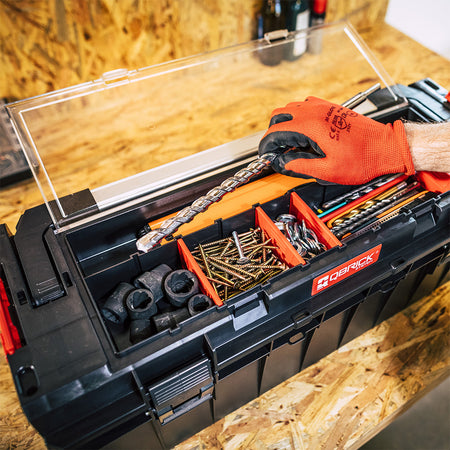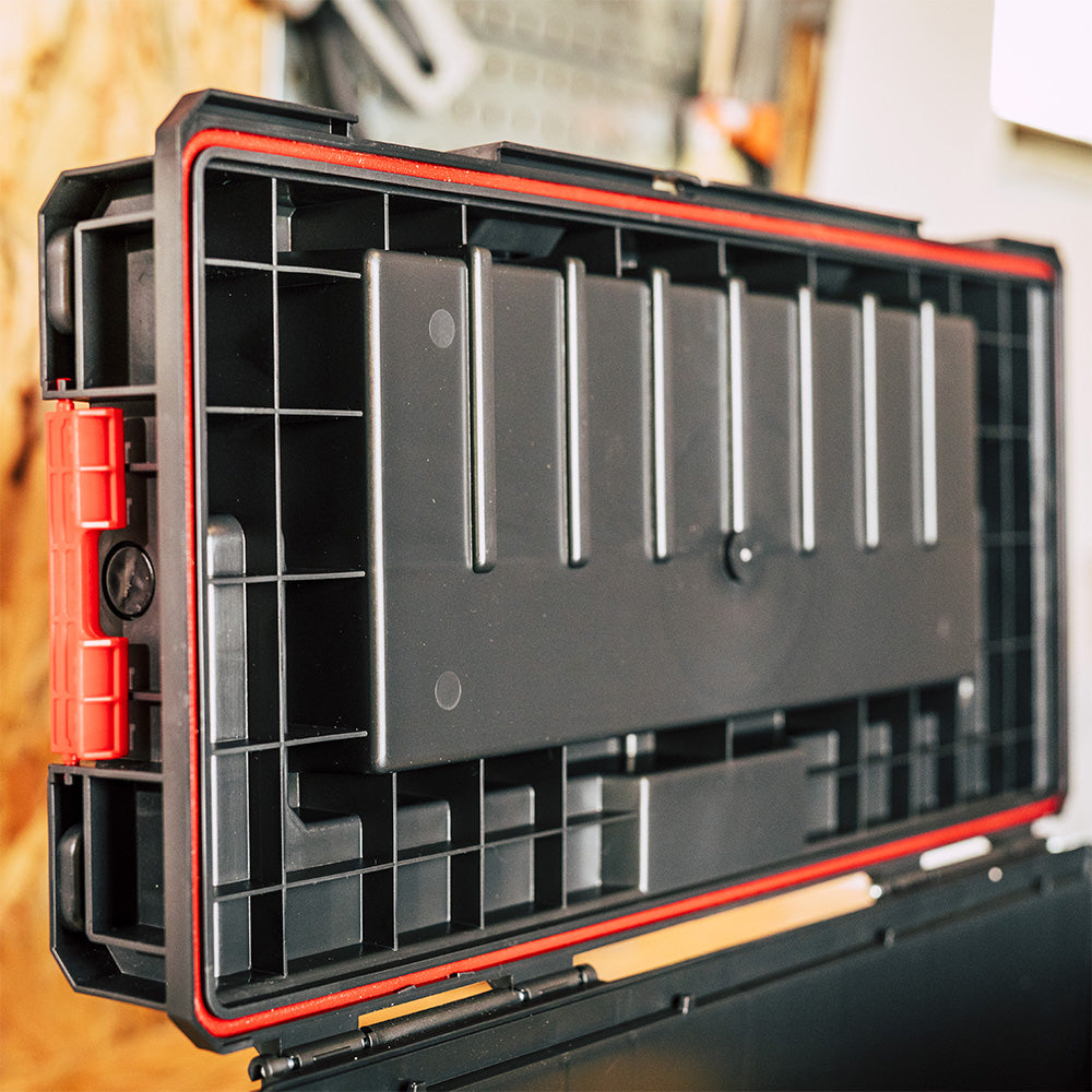 The Expert Organiser located in the lid of the box, thanks to adjustable partitions, will allow you to organise both small and long workshop accessories.