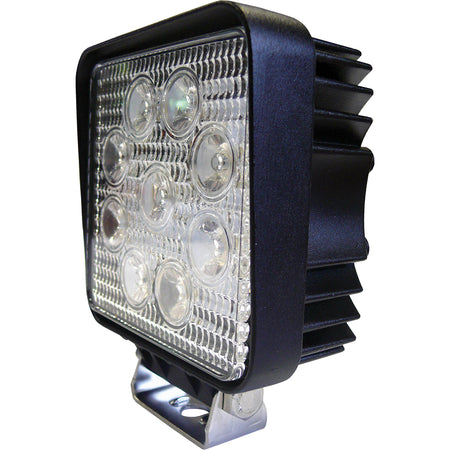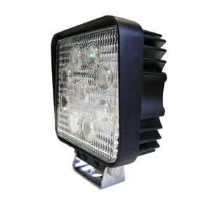 Q97270 - 27W Square LED Spot Light 60deg Spot Beam | 6000K The qest@ 27W Square LED Work Light features a die cast aluminium housing with an operating voltage of 10-30V DC and current draw of 1.7amp @13V 0.9Amp @ 24V. This work light mounts easily to surfaces with the stainless steel mounting bracket included. The work light is IP67 rated (Shockproof Dustproof & Waterproof) making it suitable for use on heavy duty machinery including vehicles excavators forklifts & Mining equipment. • 27W • 9 x 3W High Intensity LED s / 2160 Lumens • Light Distance Spot Beam: 150-200M • Light Angle Adjustable Vertically & Horizontally • Die Cast Aluminium Housing • Clear Lens Protector • Stainless Steel Mounting Bracket • Operating Voltage: 10-30V DC • Current Draw: 1.7Amp at 13V 0.9Amp at 24V • Operating Temperature: -40°C To + 60°C • Material: Aluminium housing PMMA lens • IP67 Rated (Waterproof Dustproof & Splashproof) • 128mm x 110mm x 55mm