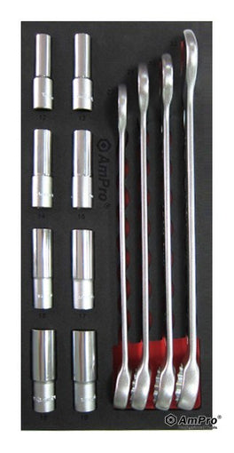 AmPro T45521 1/2"Dr Deep Socket Set & Combination Wrench Set 12pc VA Tray