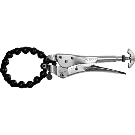 TF300 - 410IN/250MM EXHAUST PIPE CUTTER Cutting thin-walled pipe (stainless steel pipe copper pipe and PVC-pipe up to a material thickness of 1.5 mm.self-locking and with single non-pinch release lever. The chain has 15 cutter wheels.Nickel plated. Overall Length - 250mm Capacity - 19-83mm