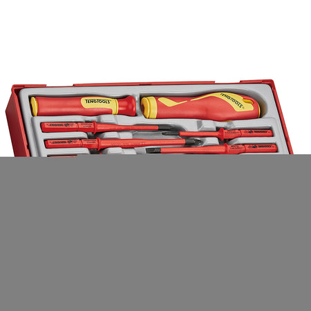 TTV710N | Teng 10pc 1000 Volt Screwdriver Set FL-PH-PZ - TC-Tray 10 piece 1 000 volt insulated screwdriver set Slim blades with reduced blade diameter for easier access to recessed screws and spring elements Includes flat (slotted) PH and PZ blades Approved for live working up to 1 000 volts Integrated protective insulation with two colours to clearly indicate if there is any damage to the insulation Supplied in the unique Teng Tools TC tray Removable lid and dove tail joints Use on it s own or as part of the Teng Tools Get Organised system Designed and manufactured to DIN5749 and EN60900 (IEC60900) Content: Insulate Handle 22 x 100mm 37 x 122mm Flat regular 0.5 x 3.0 x 70mm Flat slim type 4.0 x 100mm 5.5 x 80mm 6.5 x 100mm PH type PH1x80mm PH 2x100mm PZ type PZ 1x80mm PZ 2x100mm