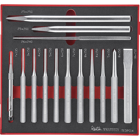 TEDPC14 - 14pc Pin Punch And Chisel Set - TED-Tray TC-Tray Modular System - GET ORGANISED WITH TENG! Tray Size: 265 x 285 x 50mm 14 piece punch and chisel set. Supplied in a plastic TC tray with removable lid. Three colour EVA foam. Fits in Teng Tools tool boxes and roller cabinets. Punches: Centre Length: 150 mm 4  5  8 mm  Automatic centre punch Parallel Length: 150 mm 3  4  5  6  7  8 mm Flat cold chisels:: 150 mm Width: 19 mm 200 mm Width: 25 mm 240 mm Width: 26 mm 250 mm Width: 25 mm