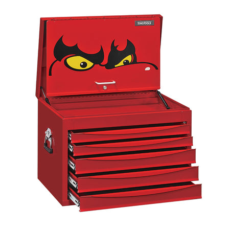 TC805SV - 5 Drawer SV-Series Top Tool Box Equipped with 5 extra deep drawers fitted with ball bearing slides. Lockable lock/front which covers the top of the drawer and the extending drawers. Lock with 2 keys. Red lacquered steel plate. 5-Step rust protection process. Heavy-duty carrying handles at the sides. Each drawer holds 4 Teng Tools TC trays. Height: 483mm Width: 660mm Depth: 455mm Net Weight: 42.5kg
