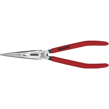 Long Nose Plier Chrome molybdenum steel. 80 cutting edge angle. Single joint. Polished head. Long straight jaws. Serrated grip surface. Rubber dipped handles. DIN 5745. Length: 140mm Cuts piano wire: 1.0mm Cuts steel wire: 1.5mm Cuts iron wire: 2.5mm