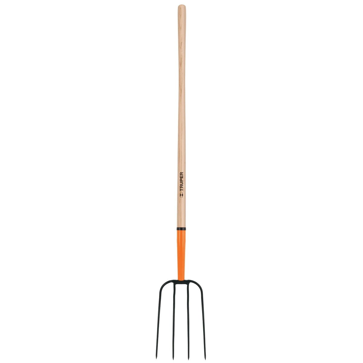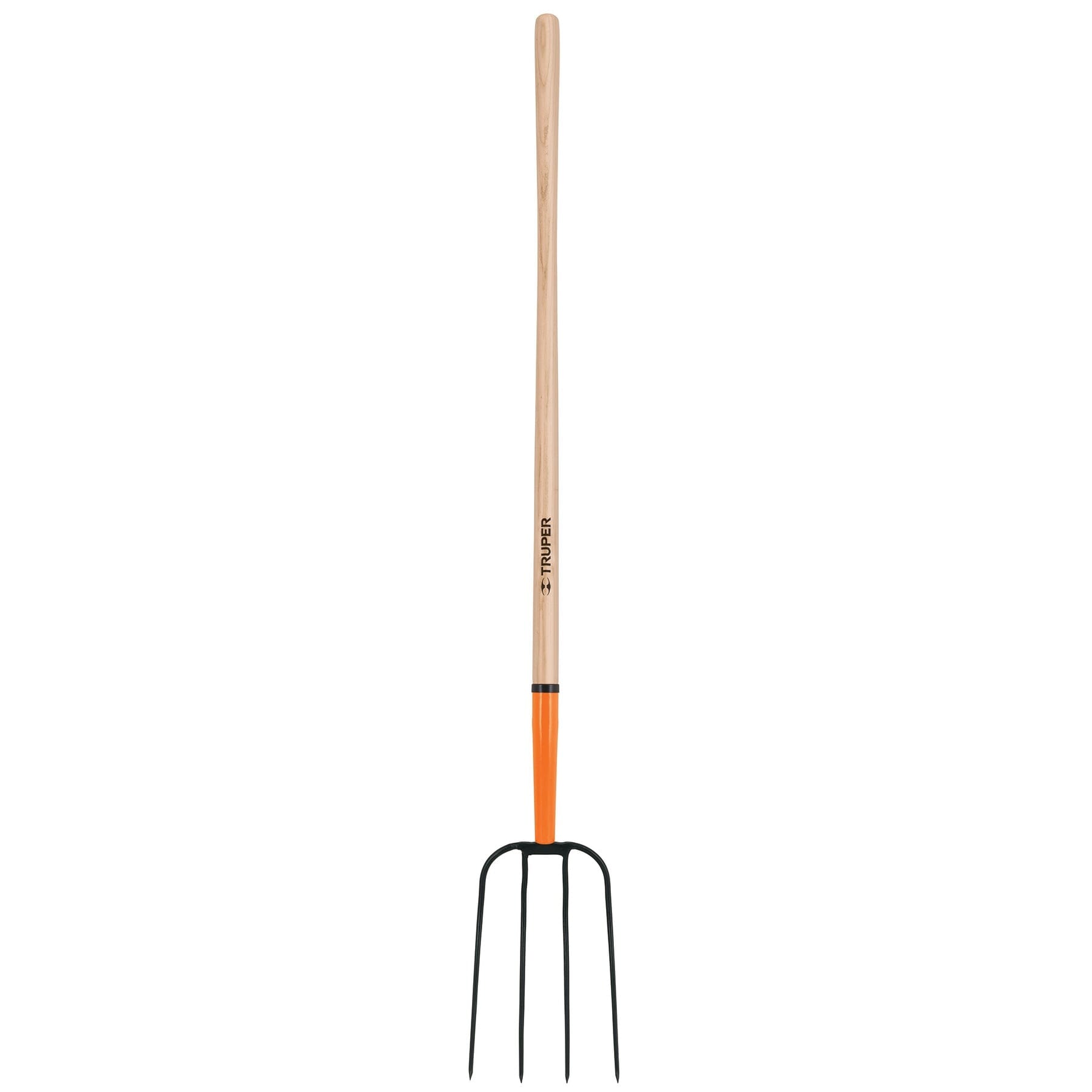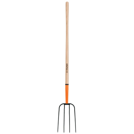 One-piece 4 tined tempered and pointed forged steel head, American Ash hardwood handle, polished, lacquered, profiled and waxed, Metal collar to join the handle to the head. Handle Length: 48" (4ft), Tines Length: 8.5"