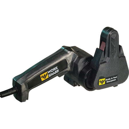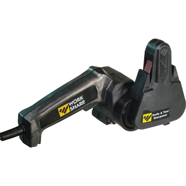 The Work Sharp Knife & Tool Sharpener is the first knife sharpener designed to sharpen every knife you own. Using flexible abrasive belts the sharpener is able to sharpen not just straight bladed knives but also curved knives tanto blades filet knives serrated knives gut hooks and virtually any other shape of knife blade. The Knife & Tool Sharpener uses precision angle sharpening guides to ensure that you get the proper angle every time. Two guides are included: a 50° guide for hunting and outdoor knives (25° per bevel) and a 40° guide for thinner blades and kitchen knives (20° per bevel).